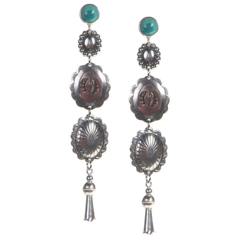 Ladies complete any look with our turquoise stud 3 silver concho dangle earrings from Paige Wallace Corp.