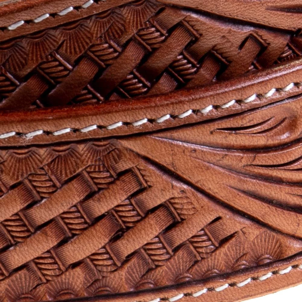 This tan leather belt features basket and floral tooling, interchangeable silver buckle, and a leather keeper.